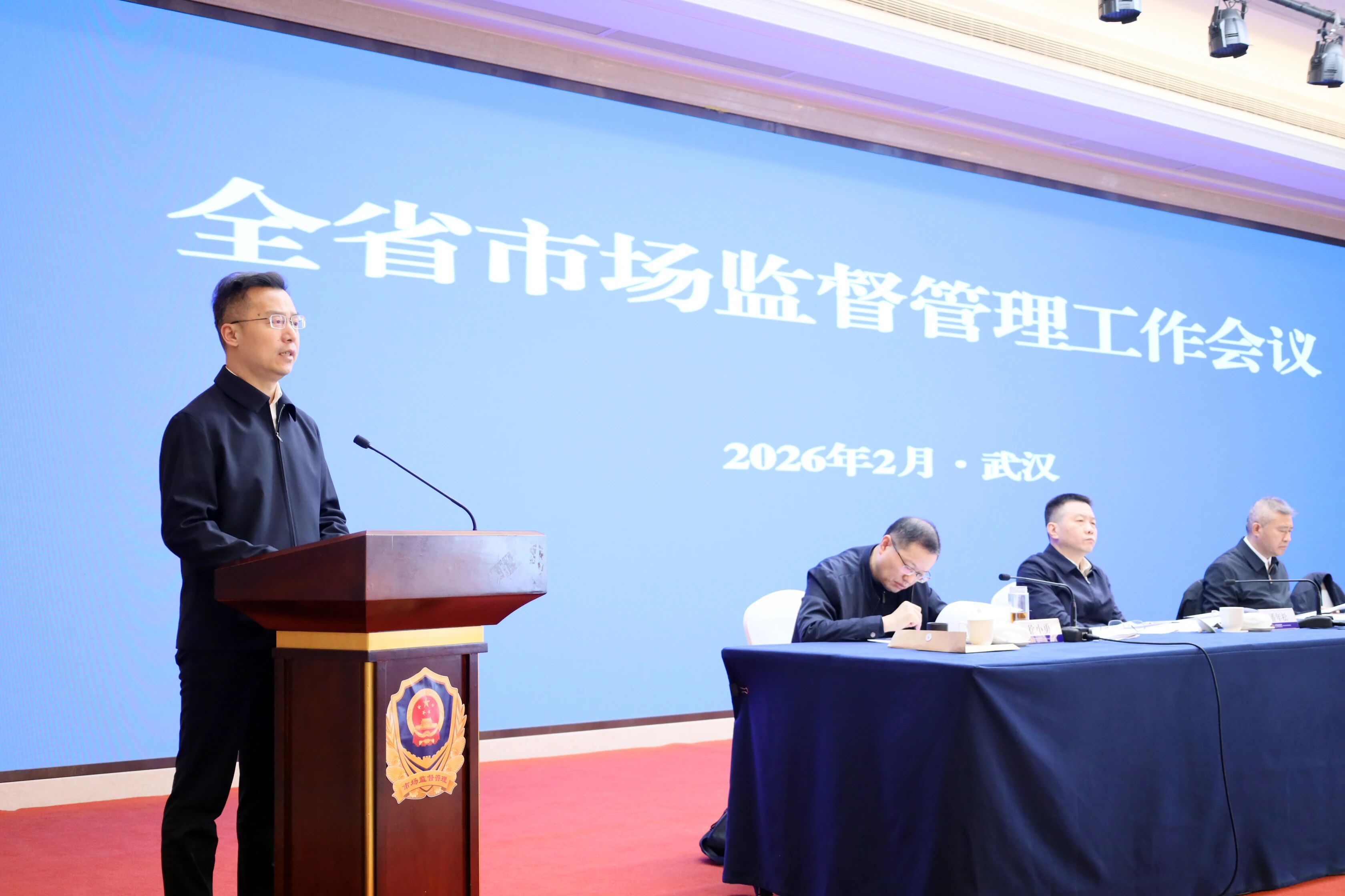 2月4日,全省市场监管工作会议在汉召开。会议深入学习贯彻党的二十大和二十届历次全会精神、中央经济工作会议精神,全面贯彻习近平总书记考察湖北重要讲话精神,认真落实省委十二届十一次全会、省委经济工作会议、省两会和全国市场监管工作会议部署要求,总结2025年和“十四五”时期工作,分析当前形势,部署2026年重点任务,动员全省系统勇担使命任务,建功支点建设,奋力实现“十五五”全省市场监管工作良好开局。省局党组书记、局长王世荣作工作报告,省局党组成员、副局长程建宏主持会议。
